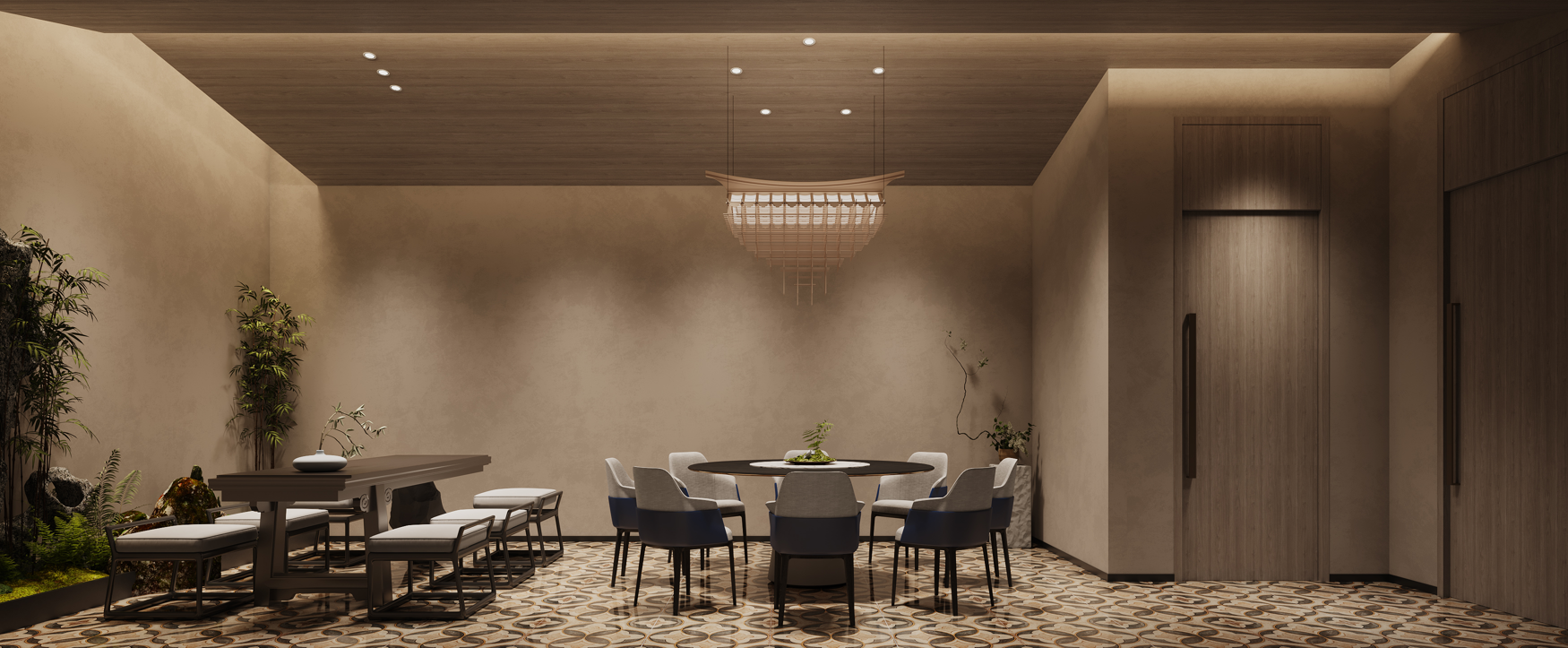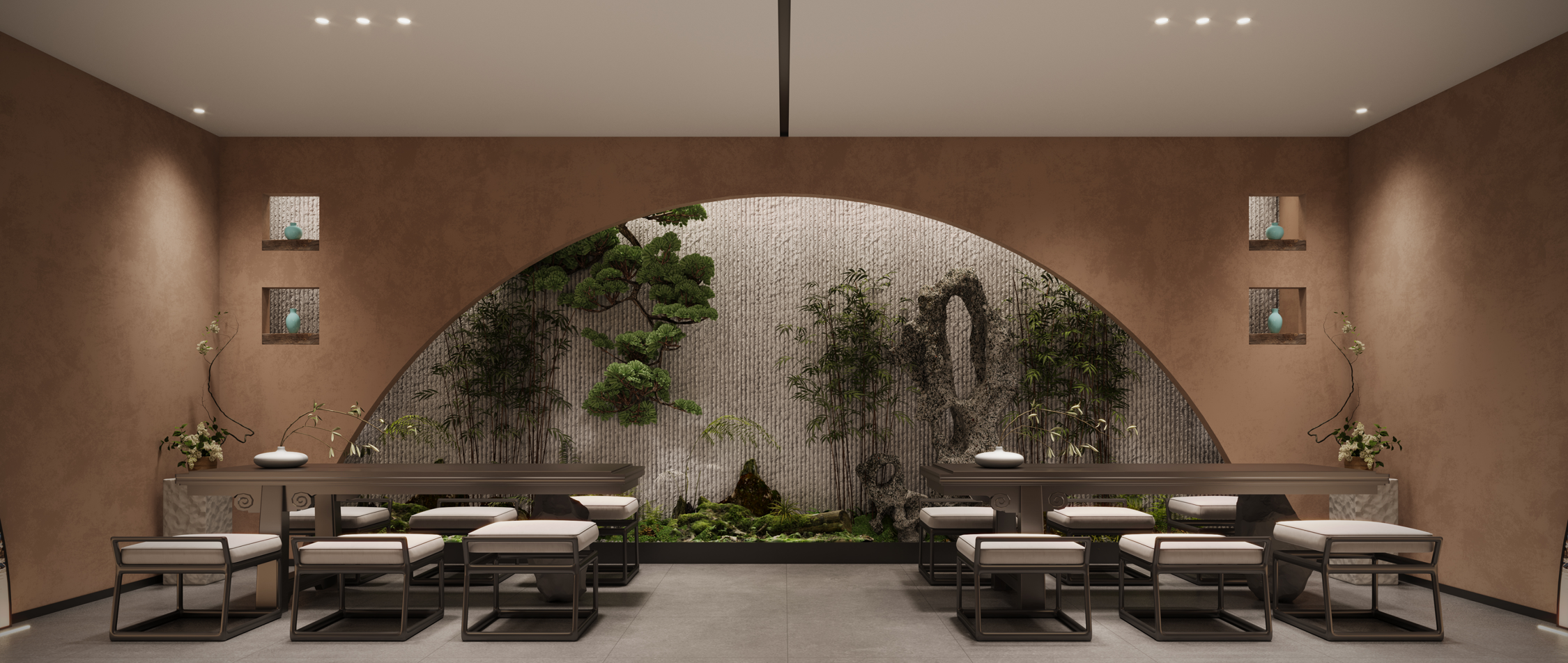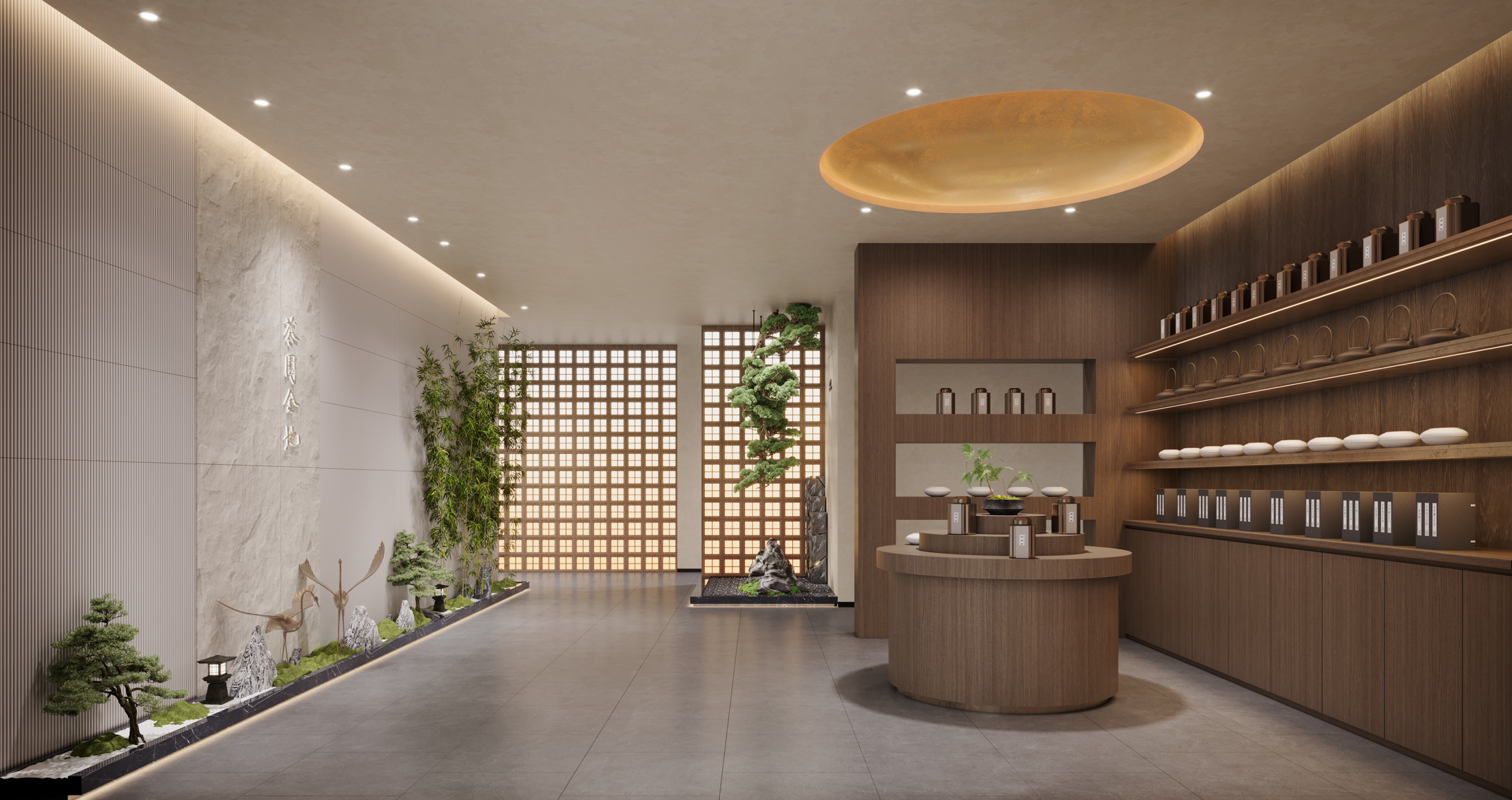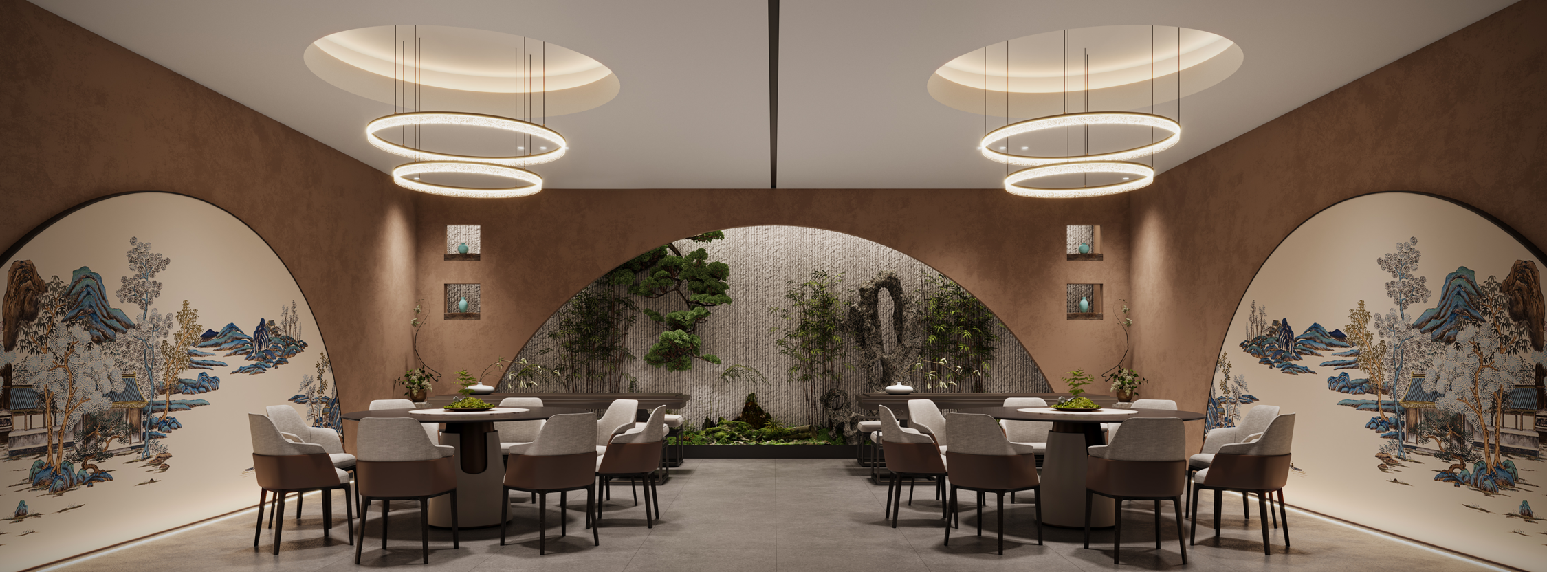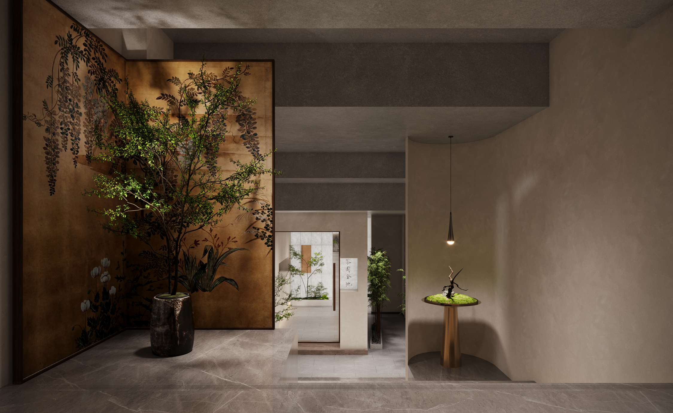 茶園金地餐廳是一家新概念粵菜餐廳。其設計是鋪開的一幅宋代美學的空間畫卷,帶你步入宋代詩詞歌賦的文化意境。